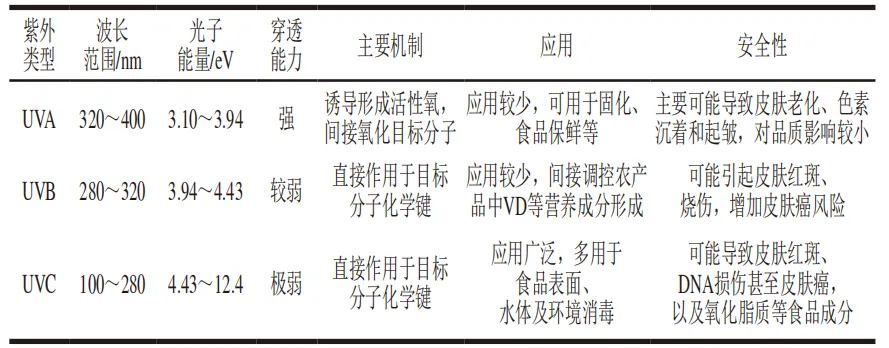 UVA辐照是使用波长为320~400 nm的紫外线对食品进行处理,可用于食品中微生物的灭活和化学污染物降解。相比于UVC,UVA能量较低,杀菌能力较弱,但穿透力更强,更适合处理具有高吸收率系数的不透明液体和生物材料。此外,UVA在特定条件下能够诱导活性基团(如活性氧或活性氮)的产生,导致微生物死亡或目标分子降解。表1总结了3种紫外线的物理特性、安全风险、作用机制及应用。