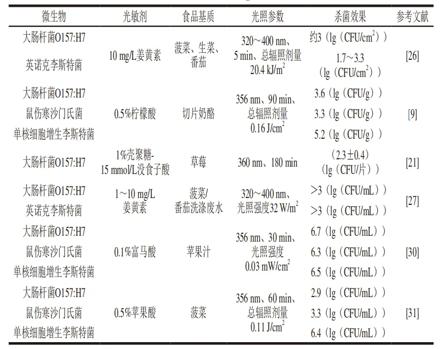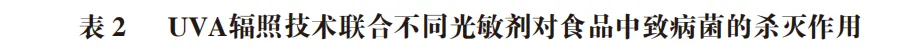 值得注意的是,当1 mmol/L阿魏酸溶液分别与UVA、温热处理及超高压联合处理时,尽管温热处理和超高压在较短时间内即可达到与UVA相似的灭活效果,但3种联合处理均能在10 min内将苹果汁中的大肠杆菌降低至检测限,有效减少因加工时间过长而对苹果汁品质的不利影响。表2总结了多项研究中UVA与不同光敏剂联合使用对细菌的灭活作用。总体而言,这些灭活作用源于光敏剂在UVA下发生的一系列氧化还原反应,从而诱导胞内氧化应激,破坏细菌膜以及其他关键位点,最终导致细菌死亡。