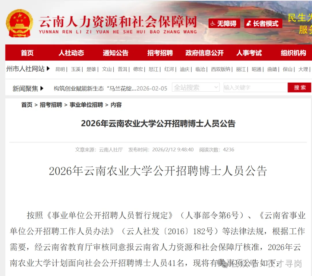 按照《事业单位公开招聘人员暂行规定》(人事部令第6号)、《云南省事业单位公开招聘工作人员办法》(云人社发〔2016〕182号)等法律法规,根据工作需要,经云南省教育厅审核同意报云南省人力资源和社会保障厅核准,2026年云南农业大学计划面向社会公开招聘博士人员41名,现将有关事项公告如下: