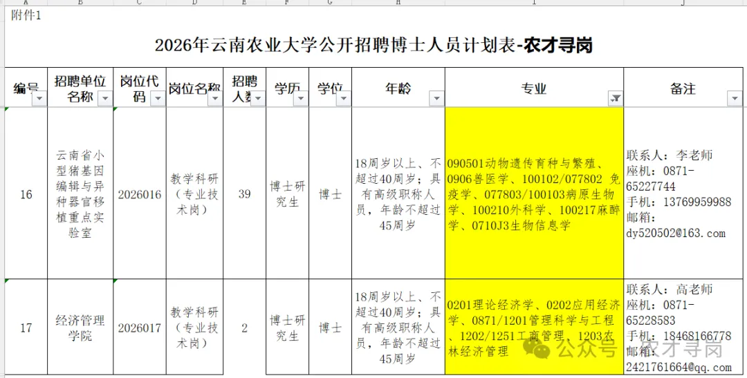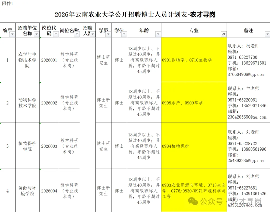 附件:1.2026年云南农业大学公开招聘博士人员计划表