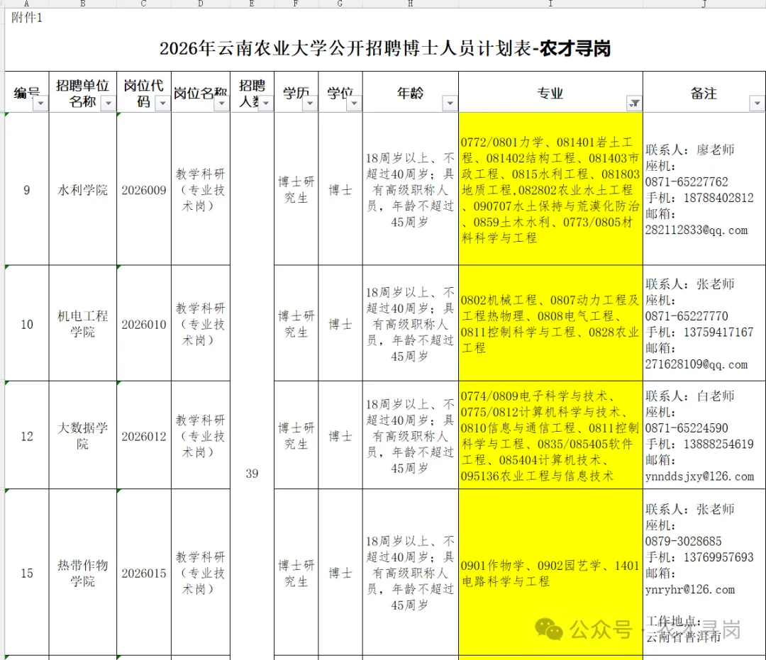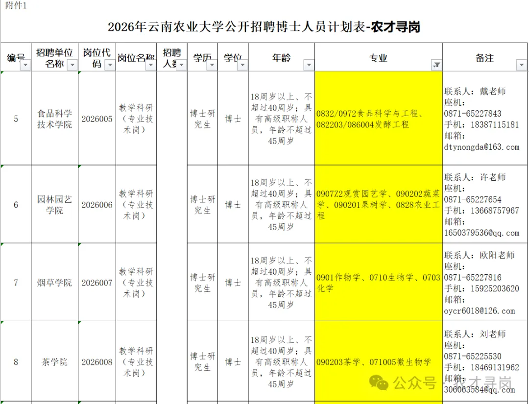 (一)具体事宜请咨询各招聘学院,联系方式详见《2026年云南农业大学公开招聘博士人员计划表》;