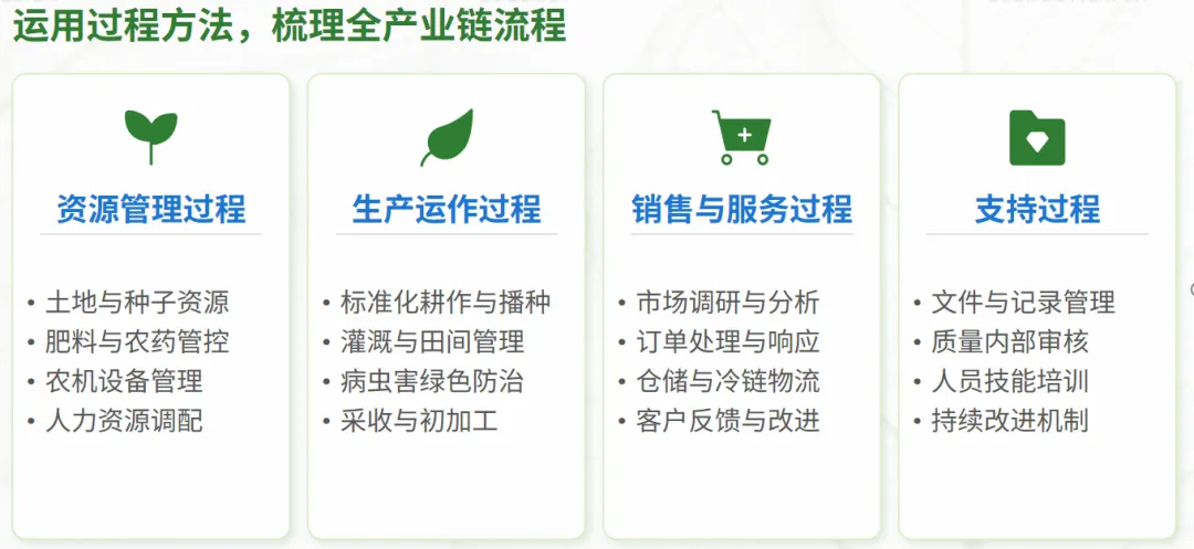 体系化建设是现代农业管理的规则与骨架,核心在于引入ISO9001国际标准化体系,为农业生产植入可追溯、可信赖的质量基因。该框架通过流程化与规范化,确保生产稳定性、可靠性与可持续性,成为对接国际市场的制度基石。ISO9001的农业应用并非工业模板的简单复制,而是结合产业特点,将过程方法与持续改进理念融入全产业链,从品种选育到终端销售,形成闭环管理。