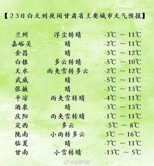 2月24日夜间到2月25日白天,酒泉、甘南、陇南、天水、平凉等市州多云转阴,局部地方有小雪(雨);省内其余地方多云或晴。