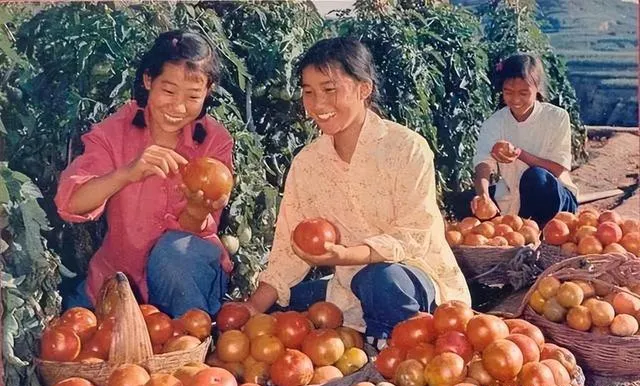 这一挑筐西红柿透着刚摘下来的新鲜,三位姑娘靠在地头,手里的西红柿又红又瓷实,那会儿没有什么瓜果大棚,全靠天吃饭,可翻进大寨地头,看着这一地红果子,谁不说一句“今年又是好收成”,有时候孩子路过忍不住捡一个,擦擦泥土就咬了一口,汁水全往下流,地里干活,谁家小孩馋嘴没人笑话你,多一个帮手还热闹。