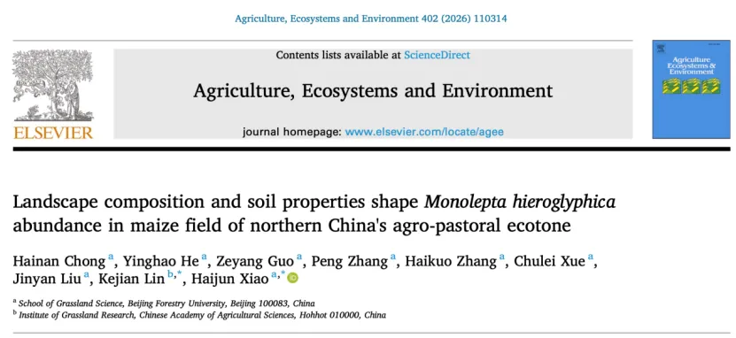 近日,北京林业大学草业与草原学院肖海军教授团队在农牧交错景观调节害虫种群研究取得新进展,相关成果以“Landscape composition and soil properties shape Monolepta hieroglyphica abundance in maize field of northern China's agro-pastoral ecotone”为题发表于《Agriculture, Ecosystems and Environment》。