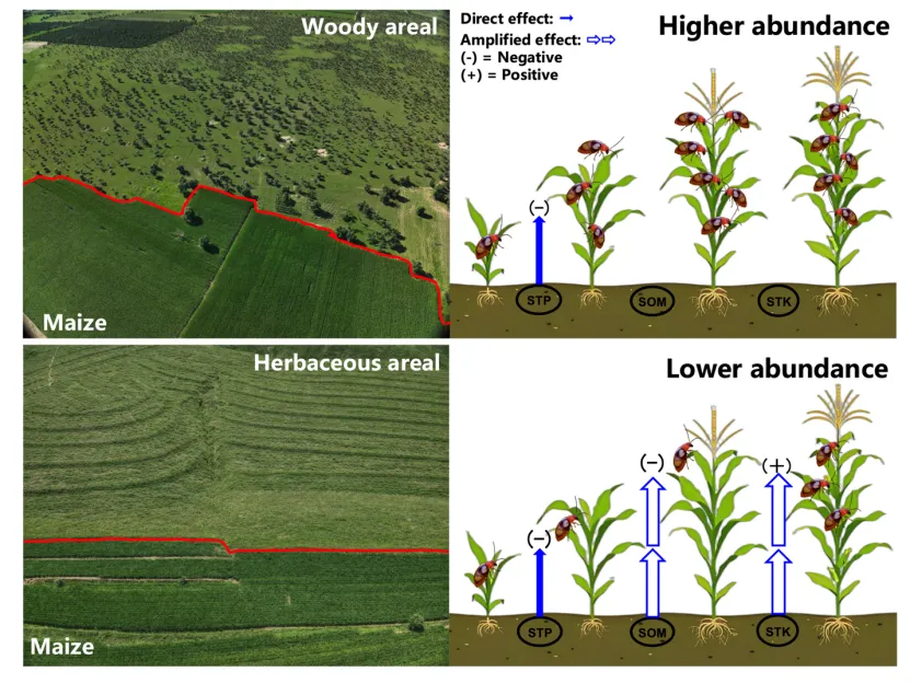 研究结果表明,与缺乏相邻牧区的玉米地相比,邻近牧区的玉米田双斑萤叶甲成虫数量显著降低。边缘密度、牧草地面积占比与害虫丰度呈负相关。土壤总磷(STP)含量对成虫丰度产生负面影响;土壤有机质、土壤总钾和大面积草地占比有交互作用:当玉米周围牧草地面积占比较高时,土壤全钾含量增加有助于促进成虫发生,而土壤有机质则有助于抑制害虫发生。本研究强调了协调景观组成和配置(边缘密度)与土壤养分管理在农牧交错区生态系统害虫种群中的重要性,建议重点保护农牧交错区中的成片牧草区域,并将景观结构和作物土壤营养管理的互作效应纳入区域害虫管理策略。