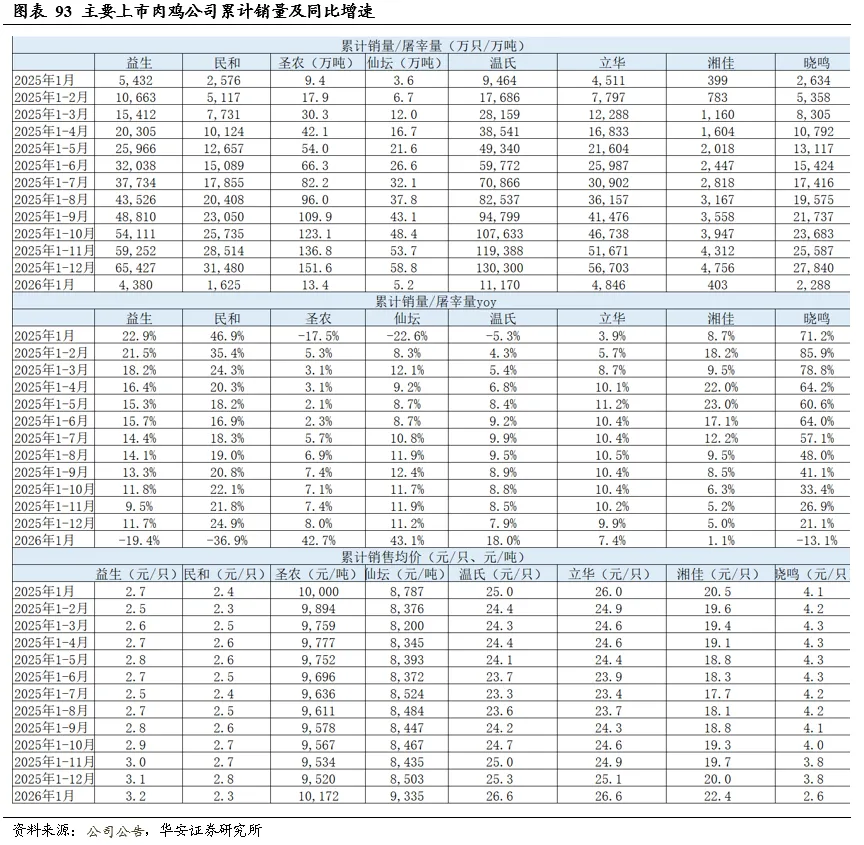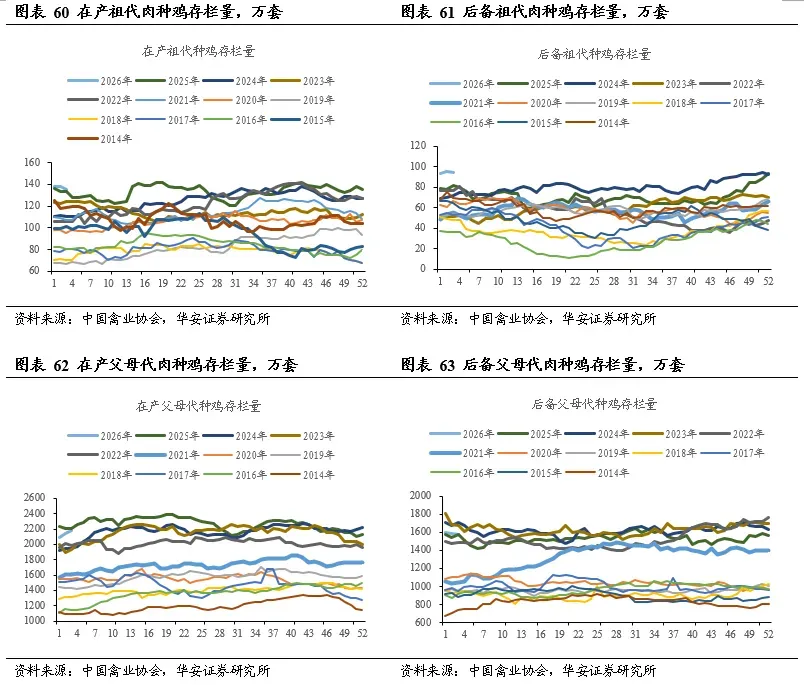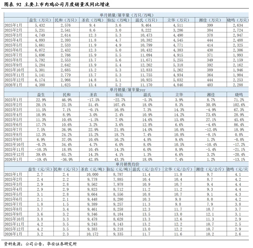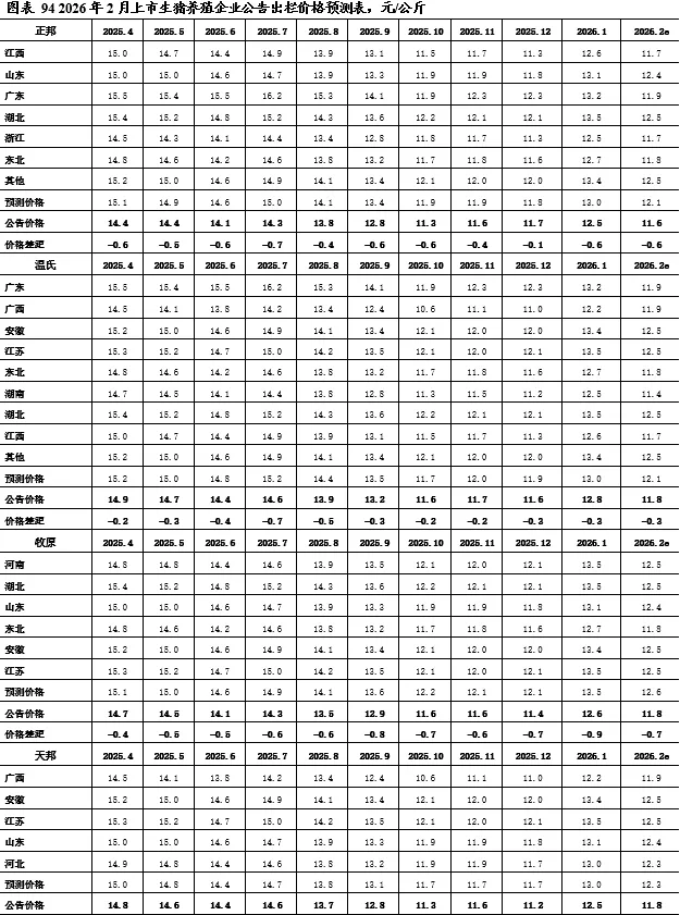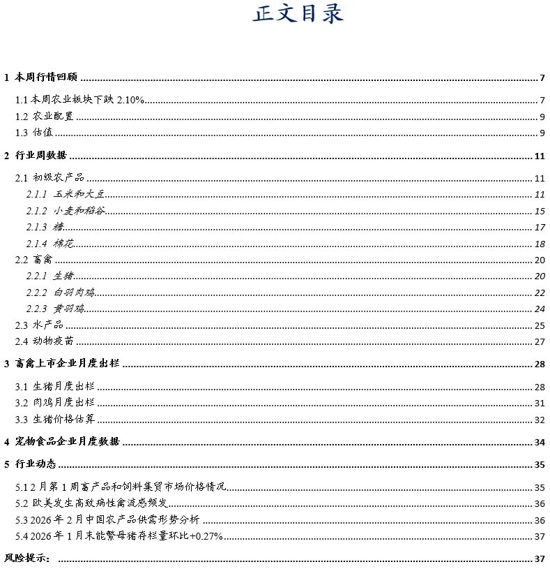 l 生猪价格节前跌至11.64元/公斤,行业有望重启去化①生猪价格跌至11.64元/公斤。本周五,全国生猪价格11.64元/公斤,周环比-3.4%。涌益咨询(2.6-2.12):全国90公斤内生猪出栏占比4.28%,周环比-0.11pct;50公斤二元母猪价格1559元/头,周环比持平,同比-5.0%;规模场15公斤仔猪出栏价471元/头,周环比持平;②生猪出栏均重126公斤,较2024、2025年春节前同期重逾4公斤。涌益咨询(2.6-2.12):全国出栏生猪均重126.05公斤,周环比-1.35公斤,较2024年、2025年春节前同期分别+4.54公斤、+4.62公斤;150kg以上生猪出栏占比5.16%,周环比-0.44pct,较2024年、2025年春节前同期-0.31pct、+0.36pct;175kg、200kg与标猪价差分别为0.93元/斤、1.25元/斤;2月10日,17省二育平均栏舍利用率19.5%,2024年、2025年春节前同期分别为27.2%、13.2%;③预计生猪行业将重启去化。春节前生猪自繁自养连亏两周,本周五亏损扩大至98.32元。2025年12 月末,能繁母猪存栏量3961万头;目前,生猪出栏均重仍显著高于2024、2025年春节前同期水平,二育未在节前出清;我们判断,春节后猪价将迎来新一波下跌,生猪养殖行业亏损有望加剧,生猪行业将迎来再次去产能;④2026年1月上市猪企出栏量同比+13.5%。1月19家上市猪企出栏量1,765万头,同比+13.5%,出栏量(万头)从高到低依次为,牧原701(仅商品猪)、温氏338、新希望140、德康农牧104、正邦93、天邦食品68、大北农(控股公司)47、唐人神45、巨星农牧(仅商品猪)40、神农集团31、天康生物30、华统股份25、京基智农25、立华股份19、金新农19、傲农生物17、东瑞16、罗牛山6、正虹科技1;出栏量同比增速从高到低依次为,正虹科技87%、京基智农80%、东瑞78%、正邦62%、金新农61%、巨星农牧(仅商品猪)61%、天邦食品56%、罗牛山51%、傲农生物35%、神农集团34%、德康农牧29%、大北农(控股公司)23%、立华股份19%、温氏17%、华统股15%、牧原3%、天康生物1%、唐人神-3%、新希望-7%;⑤估值处历史低位,继续推荐生猪养殖板块。据2025年生猪预测出栏量,牧原股份头均市值2,891元、温氏股份1,791元、新希望2,341元、德康农牧2,265元、天康生物2,699元、立华股份697元、天邦824元、正邦4,070元、巨星2,193元、神农4,304元、京基4,125元、东瑞2,507元,猪企估值多处于历史低位,我们继续推荐生猪养殖板块,重点推荐牧原股份、天康生物、温氏股份、立华股份。l 白羽肉种鸡存栏维持高位,黄羽鸡价格节前涨跌互现①白羽肉种鸡存栏维持高位。本周五,鸡产品价格9,300元/吨,周环比-0.5%,同比+1.6%。2026年第5周(2.2-2.8):在产祖代种鸡存栏量134.22万套,周环比-0.1%,在产父母代种鸡存栏量2181.3万套,周环比-0.5%,均处2019年以来同期高位;父母代鸡苗销量175.69万套,周环比+1.2%;父母代鸡苗价格52.65元/套,周环比+16.9%,同比-3.3%;②黄羽鸡价格节前涨跌互现。2026年第2周(1.12-1.18):黄羽在产祖代存栏148.1万套,处于2021年以来同期高位;黄羽在产父母代存栏1285.5万套,处于2021年以来同期低位;黄羽父母代鸡苗销量122万套,低于2025年同期水平;黄羽全国商品代毛鸡均价14.95元/公斤,周环比-0.17元/公斤,成本14.02元/公斤,毛鸡盈利0.93元/公斤,周环比-0.15元/公斤,黄羽鸡养殖行业已连续盈利5个多月。2月13日,三黄鸡均价16.28元/公斤,周环比+0.6%,同比+1.5%;2月10日,青脚麻鸡均价4.4元/斤,周环比-6.4%,同比+7.3%。l 25/26年全球玉米、小麦库消比预测值环比下降,大豆环比上升①25/26全球玉米库消比预测值处环比-0.1pct。USDA2月供需报告预测:25/26年全球玉米库消比19.3%,同比-1.3pct,环比-0.1pct,处15/16年以来最低水平。中国农业农村部市场预警专家委员会月报:2月对中国玉米供需形势预测与1月一致,25/26年结余变化821万吨,较24/25年大幅上升933万吨;②25/26全球小麦库消比预测值环比-0.2pct。USDA22月供需报告预测:25/26年度全球小麦库消比26.5%,同比+1.0pct,环比-0.2pct,处15/16年以来偏低水平;③25/26全球大豆库消比预测值环比+0.1pct。USDA2月供需报告预测:25/26年度全球大豆库消比20.5%,同比-0.2pct,环比+0.1pct。中国农业农村部市场预警专家委员会月报:2月对中国大豆供需形势预测与1月一致,25/26年结余变化241万吨,较24/25年大幅下降897万吨。1 本周行情回顾