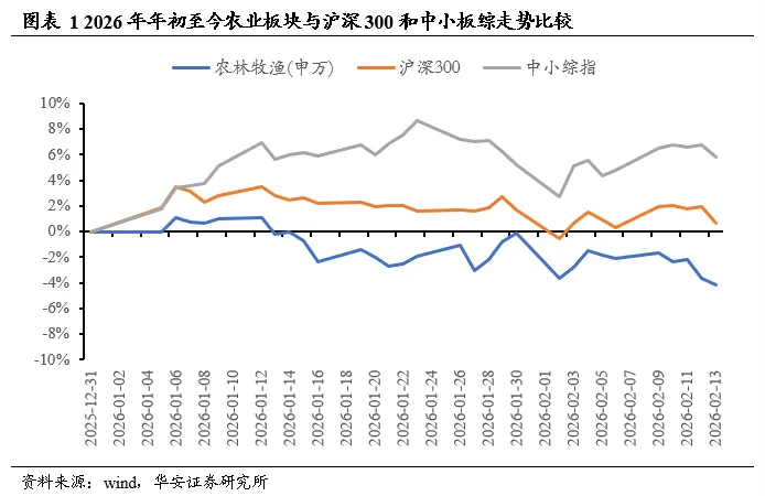 本周(2026年2月9日-2026年2月13日)农林牧渔(申万)指数下跌2.10%,沪深300指数上涨0.36%,中小板综指数上涨0.95%,农业指数跑输沪深300指数2.47个百分点。