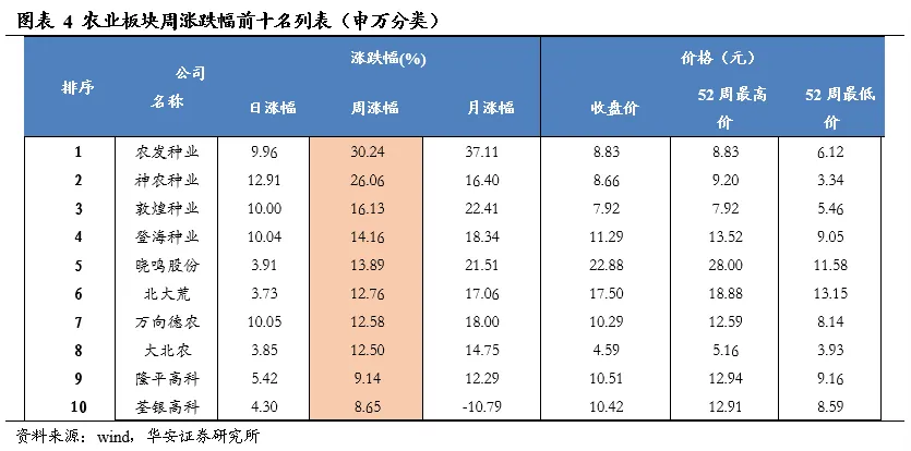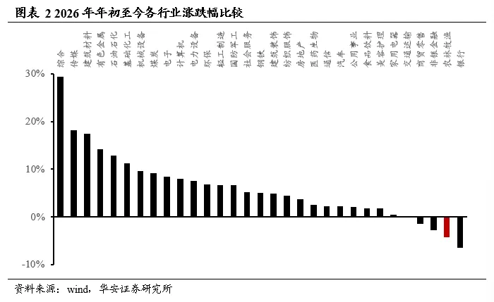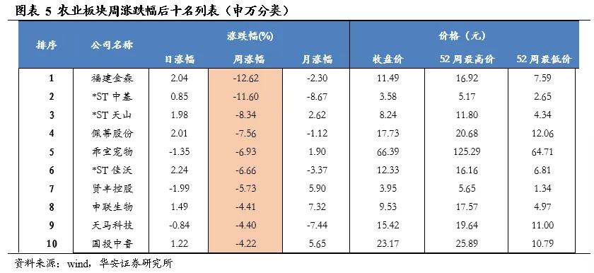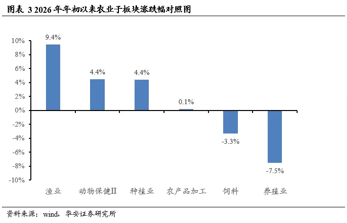 2026年初至今,农业各子板块涨幅从高到低依次为渔业(+9.4%)、动物保健Ⅱ(+4.4%)、种植业(+4.4%)、农产品加工(+0.1%)、饲料(-3.3%)、养殖业(-7.5%)。