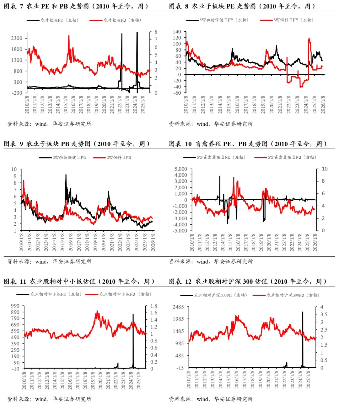 2026年2月13日,农业板块绝对PE和绝对PB分别为26.44倍和2.50倍,2010年至今农业板块绝对PE和绝对PB的历史均值分别为108.90倍和3.55倍;农业板块相对中小板PE和PB分别为0.58倍和0.85倍,历史均值分别为3.08倍和1.09倍;农业板块相对沪深300 PE和PB分别为1.97和1.78倍,历史均值分别为9.22倍和2.34倍。