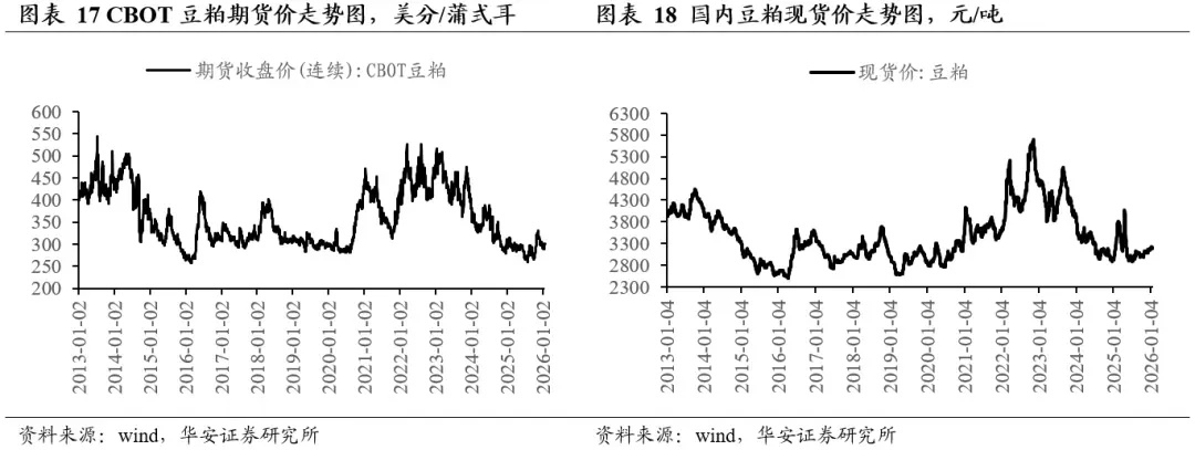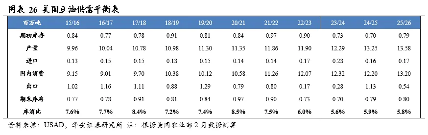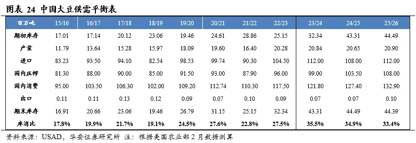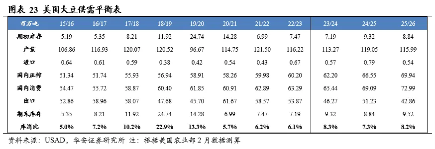 分国别看,2025/26年度美国大豆产量1.16亿吨,国内消费量7,299万吨,期末库存952万吨,库消比8.2%,较24/25年度上升0.87个百分点;2025/26年度中国大豆产量2,090万吨,国内消费量1.33亿吨,期末库存4,439万吨,库消比33.4%,较24/25年度下降1.53个百分点。