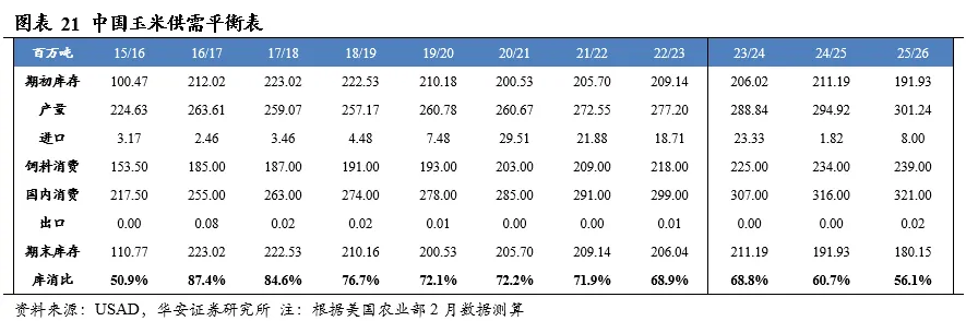 分国别看,2025/26年度美国玉米产量4.32亿吨,国内消费量3.35亿吨,期末库存5,402万吨,库消比12.9%,较24/25年度上升2.66个百分点;2025/26年度中国玉米产量3.01亿吨,国内消费量3.21亿吨,期末库存1.80亿吨,库消比56.1%,较24/25年度下降4.62个百分点。