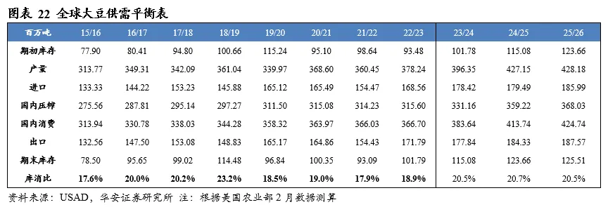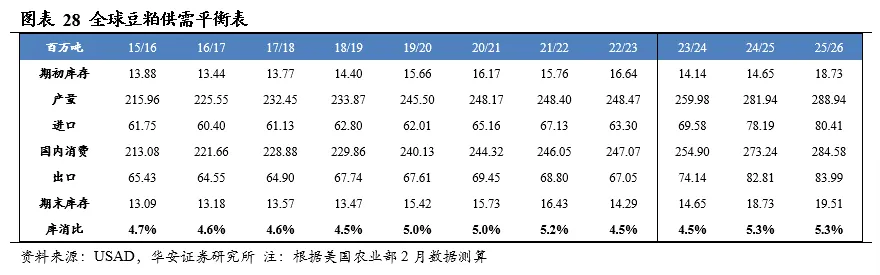 美国农业部2026年2月供需报告预测,2025/26年度全球大豆产量4.28亿吨,国内消费量4.25亿吨,期末库存1.26亿吨,库消比20.5%,预测值较24/25年度下降0.18个百分点。