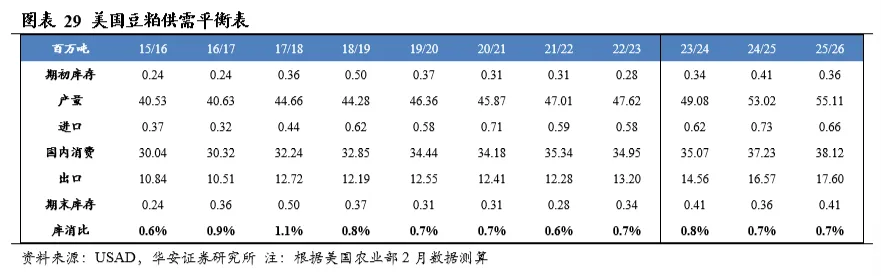 美国农业部2026年2月供需报告预测,2025/26年度全球豆粕产量2.89亿吨,国内消费量2.85亿吨,期末库存1,951万吨,库消比5.3%,较24/25年度上升0.03个百分点。2025/26年度美国豆粕产量5,511万吨,国内消费量3,812万吨,期末库存41万吨,库消比0.7%,较24/25年度上升0.07个百分点。