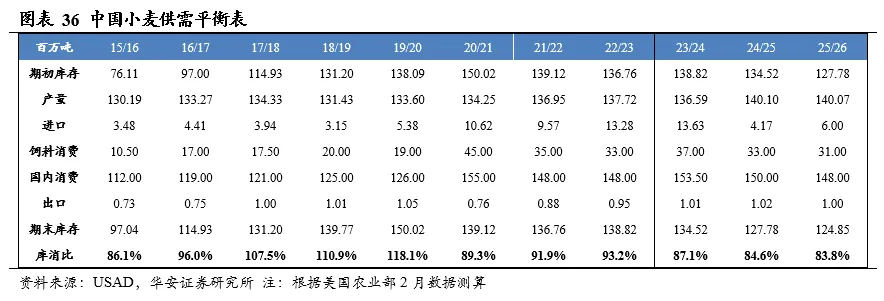 分国别看,2025/26年度美国小麦产量5,401万吨,国内消费量3,071万吨,期末库存2,534万吨,库消比45.9%,较24/25年度上升2.51个百分点;2025/26年度中国小麦产量1.40亿吨,国内消费量1.48亿吨,期末库存1.25亿吨,库消比83.8%,较24/25年度下跌0.82个百分点。