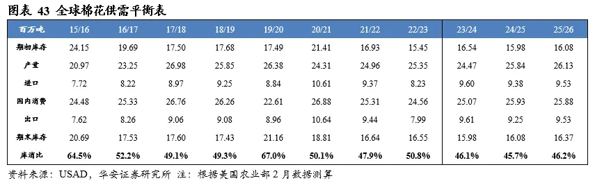 美国农业部2026年2月供需报告预测,2025/26年度全球棉花产量2,613万吨,国内消费量2,588万吨,期末库存1,637万吨,库消比46.2%,较24/25年度上升0.53个百分点。