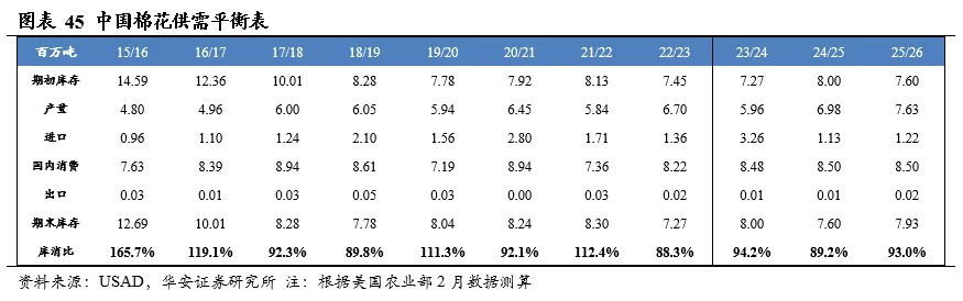 分国别看,2025/26年度美国棉花产量303万吨,国内消费量35万吨,期末库存96万吨,库消比32.4%,较24/25年度上升2.94个百分点;2025/26年度中国棉花产量763万吨,国内消费量850万吨,期末库存793万吨,库消比93.0%,较24/25年度上升3.84个百分点。