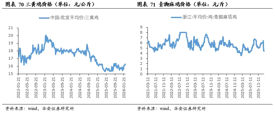 2026年2月13日,三黄鸡均价16.28元/公斤,周环比涨0.56%,同比涨1.50%;2026年2月10日,青脚麻鸡均价4.40元/斤,周环比跌6.38%,同比涨7.32%。