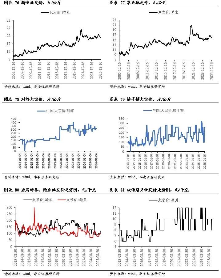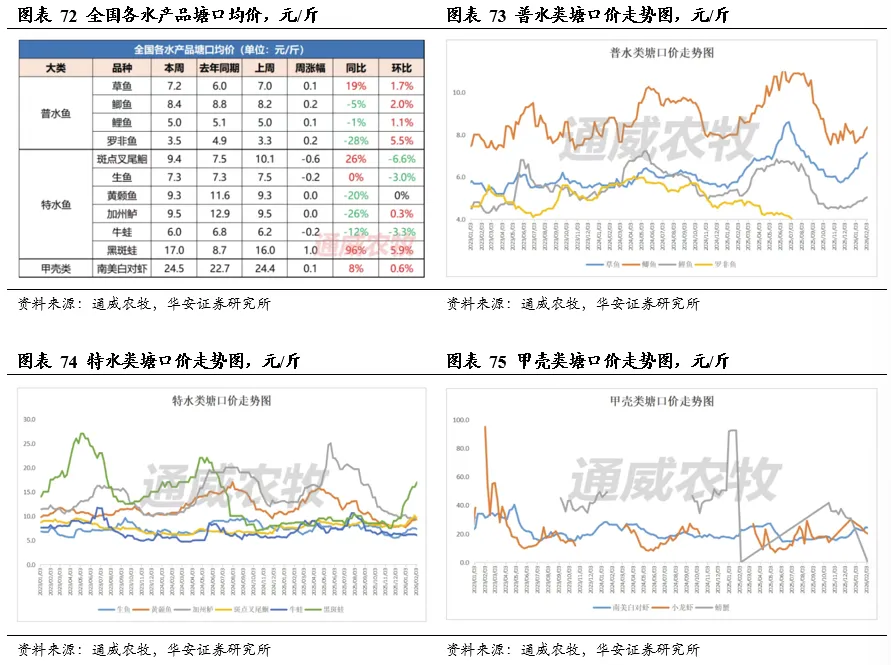 2026年2月6日,鲫鱼批发价21.53元/公斤,周环比跌0.37%,同比涨1.13%;草鱼批发价16.99元/公斤,周环比涨1.31%,同比涨8.01%。