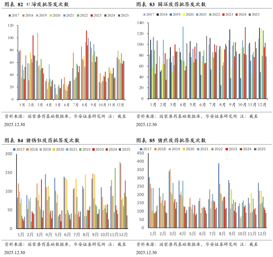 2025年1-12月,猪用疫苗批签发数同比增速由高到低依次为,腹泻苗+16.1%、猪圆环疫苗+10.4%、猪乙型脑炎疫苗+9.0%、猪伪狂犬疫苗+5.7%、口蹄疫苗+5.2%、猪瘟疫苗-4.8%、猪细小病毒疫苗-13.2%、高致病性猪蓝耳疫苗-18.7%。