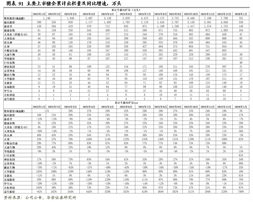2026年1月,19家上市猪企出栏量1,765万头,同比+13.5%,出栏量(万头)从高到低依次为,牧原701(仅商品猪)、温氏338、新希望140、德康农牧104、正邦93、天邦食品68、大北农(控股公司)47、唐人神45、巨星农牧(仅商品猪)40、神农集团31、天康生物30、华统股份25、京基智农25、立华股份19、金新农19、傲农生物17、东瑞16、罗牛山6、正虹科技1;出栏量同比增速从高到低依次为,正虹科技87%、京基智农80%、东瑞78%、正邦62%、金新农61%、巨星农牧(仅商品猪)61%、天邦食品56%、罗牛山51%、傲农生物35%、神农集团34%、德康农牧29%、大北农(控股公司)23%、立华股份19%、温氏17%、华统股15%、牧原3%、天康生物1%、唐人神-3%、新希望-7%。