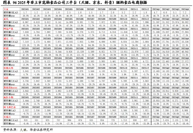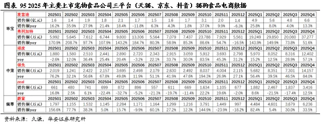 2025Q1-Q4,猫狗食品三平台(天猫、京东、抖音)销售额同比+18.5%、+9.5%、+5.5%、8.8%;2025年12月,猫狗食品三平台(天猫、京东、抖音)销售额同比-11.3%。
