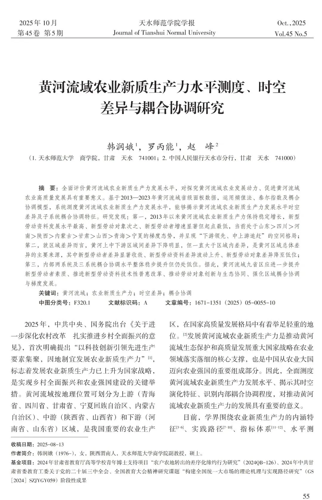 韩润娥、罗丙能、赵峰|黄河流域农业新质生产力水平测度、时空差异与耦合协调研究(刊发于《天水师范学院学报》2025年第5期)