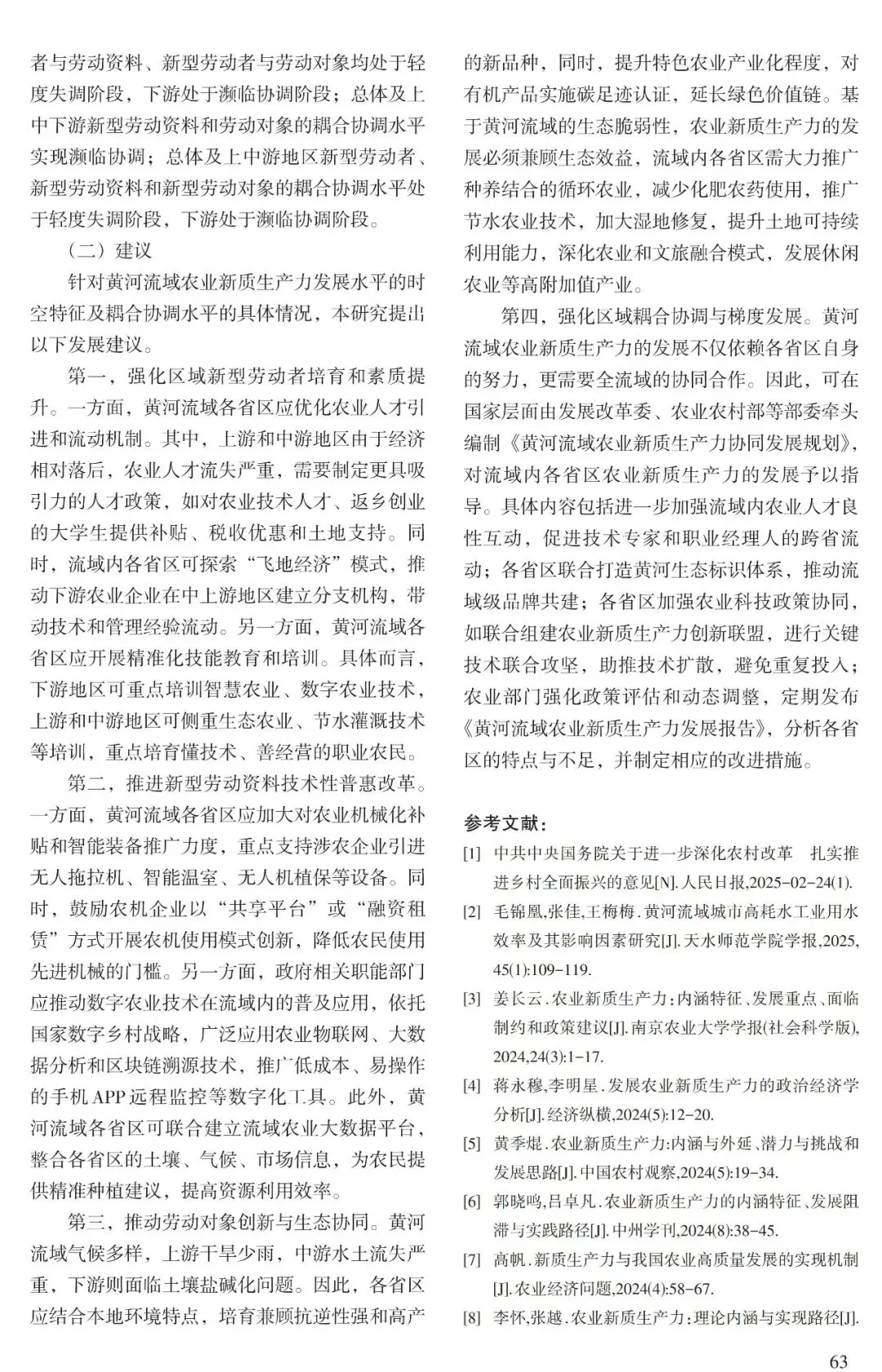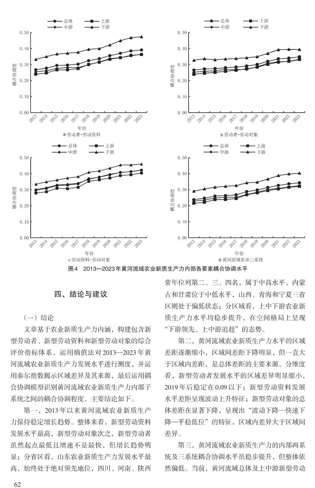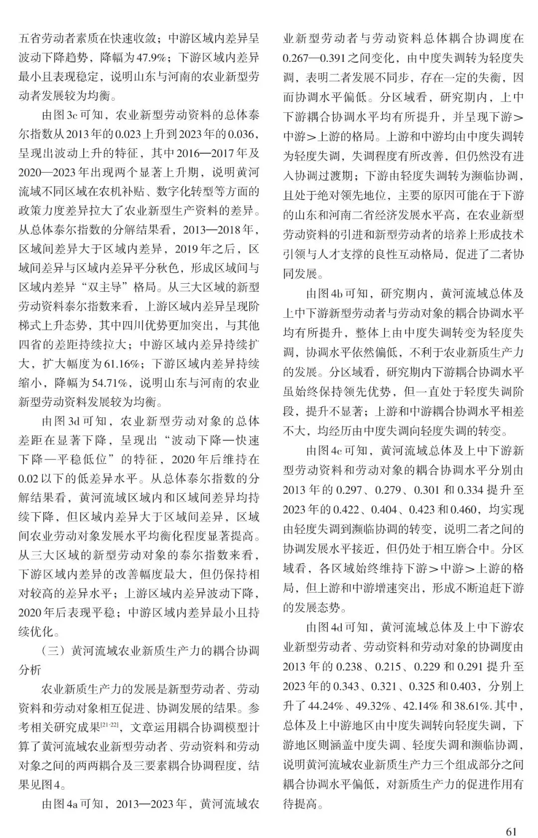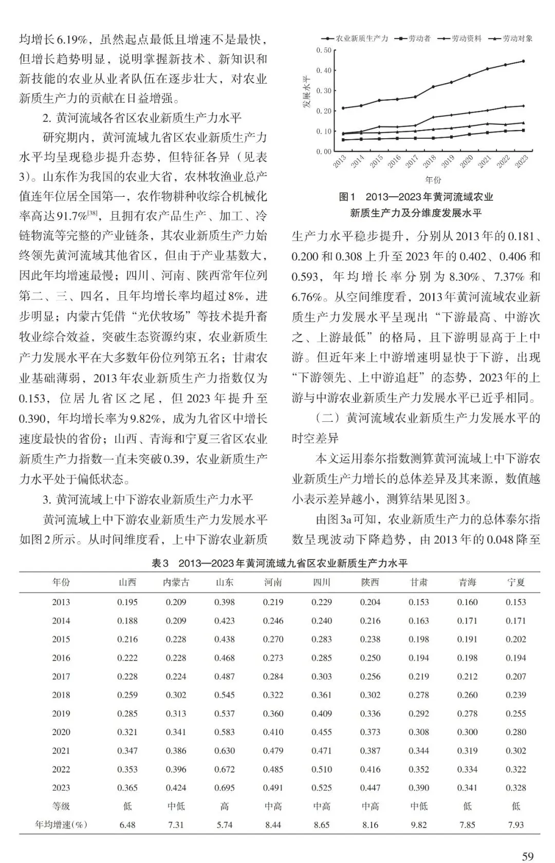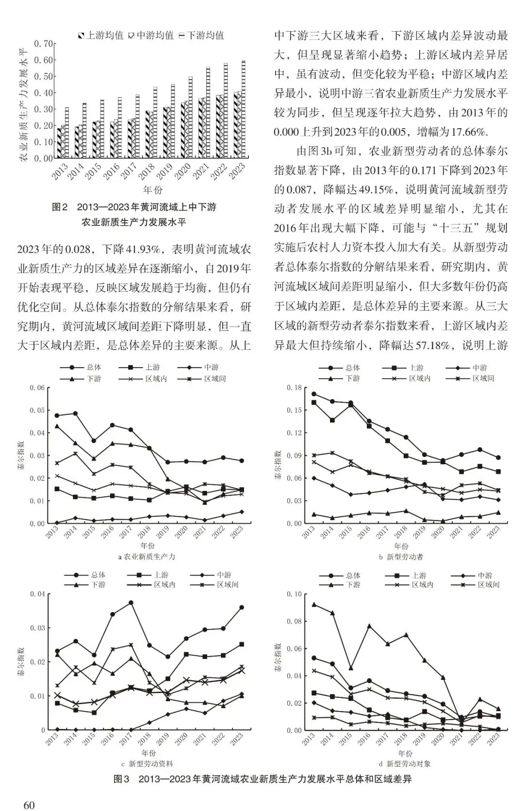 全面评价黄河流域农业新质生产力发展水平,对探究黄河流域农业发展动力、促进黄河流域农业高质量发展具有重要意义。基于2013—2023年黄河流域省级面板数据,运用熵值法、泰尔指数及耦合协调模型,系统测度黄河流域农业新质生产力发展水平,能够揭示黄河流域农业新质生产力发展水平时空差异及子系统耦合协调特征。研究发现:第一,2013年以来黄河流域农业新质生产力保持稳定增长,新型劳动资料发展水平最高、新型劳动对象次之、新型劳动者增速显著但起点最低,当前处于山东>四川>河南>陕西>内蒙古>甘肃>山西>青海>宁夏的梯度态势,并呈现“下游领先、中上游追赶”的空间格局;第二,就区域差异而言,黄河上中下游区域间差异下降明显,但一直大于区域内差异,是黄河区域总体差异的主要来源,其中新型劳动者差异显著收敛、新型劳动资料差异波动上升、新型劳动对象差异降至低位;第三,内部两系统及三系统耦合协调水平整体稳步提升但仍处低位。据此,黄河流域九省区应进一步提升新型劳动者素质、推进新型劳动资料技术性普惠改革、推动劳动对象创新与生态协同、强化区域耦合协调与梯度发展。