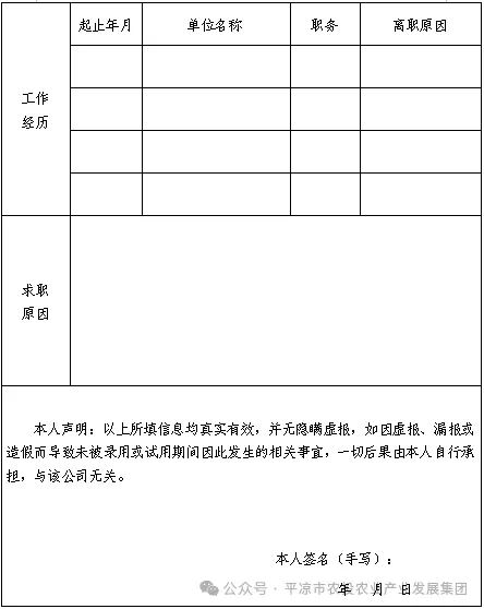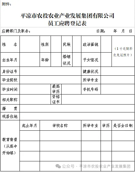附件:平凉市农投农业产业发展集团有限公司员工应聘登记表