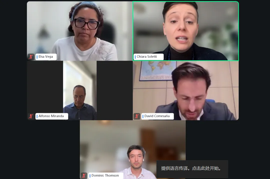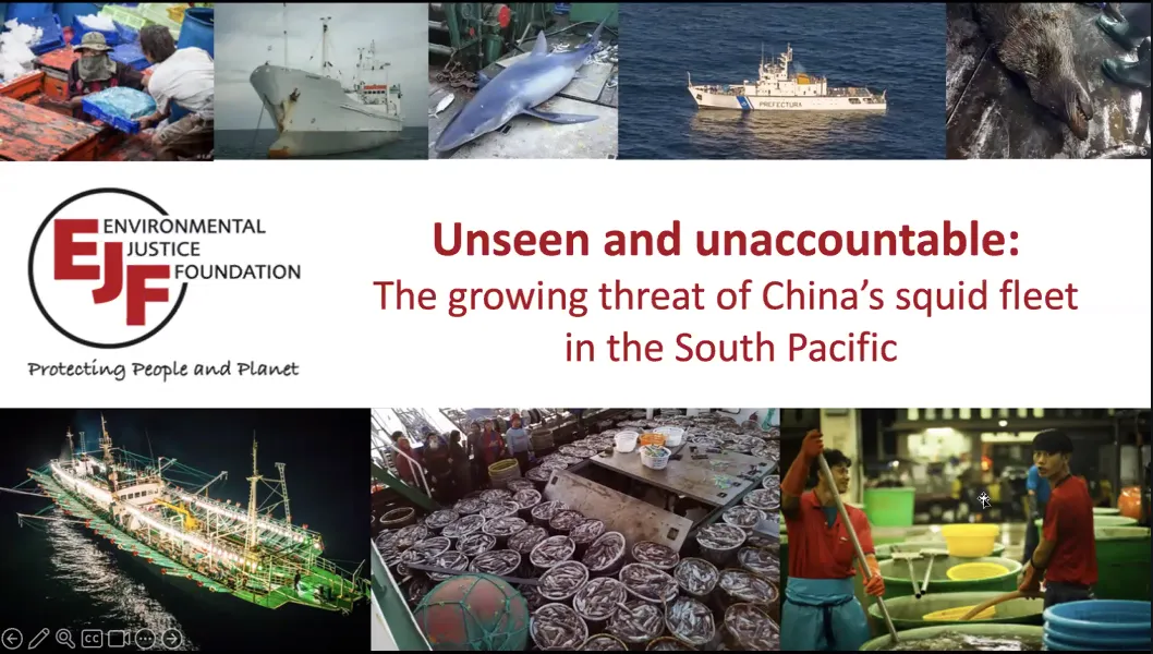 会议组织者和线上报告人Dominic来自环境正义基金会,邀请了秘鲁全国手工渔民协会主席Elsa Vega,南太平洋巨型鱿鱼可持续管理委员会主任、前渔业部副部长Alfonso, 秘鲁海洋研究院高级顾问、曾任秘鲁生产部渔业管理司司长现在法国卫星渔业监控公司秘鲁区总经理David。