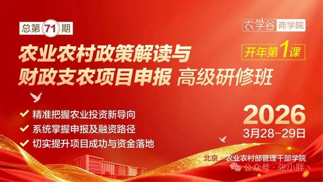 为深入贯彻落实 2026 年农业农村领域各项核心政策,帮助相关单位精准把握“十五五”农业投资导向,系统掌握财政支农项目申报流程、关键要点及融资实操路径,切实提升项目申报成功率与资金落地效率。中国农民研修学院决定举办 2026 年农业农村政策解读与财政支农项目申报高级研修班。