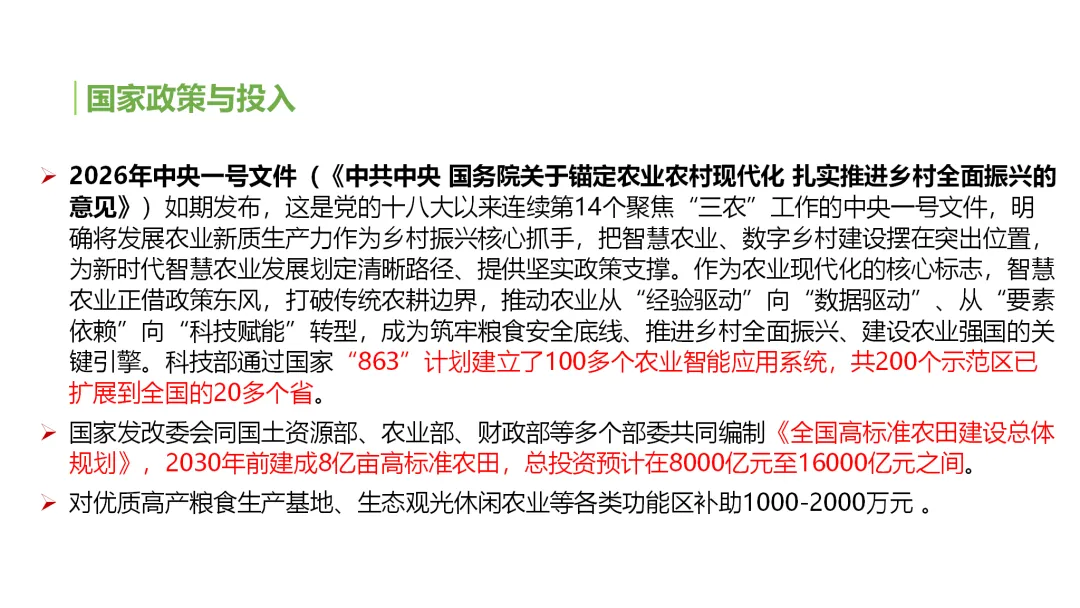 智慧农业的规模化、高质量发展,离不开国家政策的持续赋能和顶层设计。2026年中央一号文件作为“十五五”开局之年的核心“三农”政策,在继承以往政策导向的基础上,进一步升级支持力度、细化落实举措,围绕智慧农业发展作出系统性部署,推动智慧农业从“试点示范”向“全面普及”、从“单点应用”向“全链融合”跨越,构建起“技术研发+场景应用+资金支持+人才保障”的全方位政策体系。