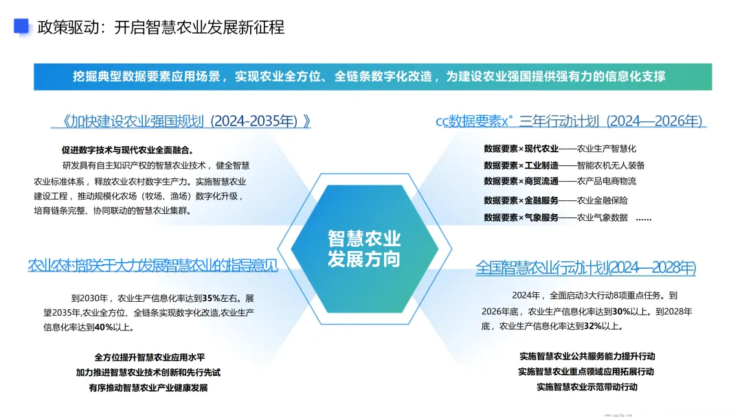 2026年中央一号文件作为最新指引,对智慧农业的部署更具体、更务实、更具针对性,核心举措聚焦四大方面,均体现了“农业新质生产力培育”的核心导向: