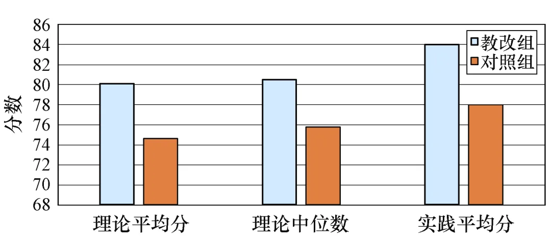 通过教学内容和方法的改革,取得了显著的成效,如图1所示。在知识掌握方面,学生对数据库原理、设计和管理等核心知识的理解更加深入,理论考试成绩得到明显提升。教改组理论平均分为80.1,相比对照组的74.6有显著提高;理论中位数达到80.5,高于对照组的75.8,表明学生对理论知识的整体掌握程度更好。在实践能力方面,学生通过项目驱动教学法和实际案例分析,能够更加熟练地运用所学知识解决实际问题,实践操作能力大幅增强。教改组实践平均分达到84,高于对照组的78,充分体现了学生在实践技能方面的进步。