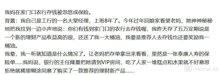 近日,一则关于农业银行储户存款变保险的消息引发关注。一位自称工商银行工作八年的网友爆料,其母亲在农业银行办理业务时,被银行工作人员以“高收益理财产品”和赠送食用油为诱饵,引导至VIP室,最终在未完全理解的情况下,将五万元存款变成了泰康人寿的保险单。