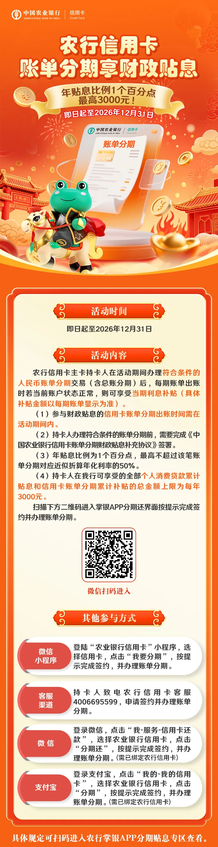 >农行信用卡账单分期享财政贴息【WOW福利】