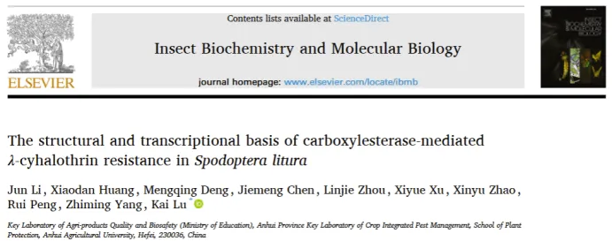 “The structural and transcriptional basis of carboxylesterase-mediated λ-cyhalothrin resistance in Spodoptera litura”文章发表在《Insect Biochemistry and Molecular Biology》。本研究系统阐明了斜纹夜蛾羧酸酯酶(COEs)介导高效氯氟氰菊酯抗性的结构基础与转录调控机制,证实转录因子HNF4驱动的关键COE基因过表达是抗性产生的核心原因,明确了COE066的His447残基是杀虫剂结合、代谢的关键功能位点,为鳞翅目害虫抗药性治理提供了全新分子靶点。
