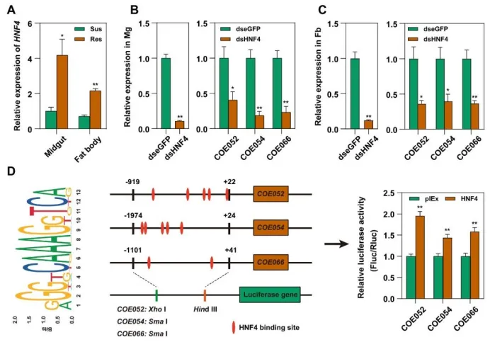 抗性品系中肠与脂肪体COE酶活显著升高,COE特异性抑制剂TPP可使抗性水平下降超50%,证实COEs是抗性的核心介导因子;筛选到3个在抗性品系中肠超百倍上调的COE基因(COE052/054/066),其中COE052和COE066是抗性关键基因,COE054的功能缺失可被另外两个基因代偿性过表达掩盖;3个COE均能降解高效氯氟氰菊酯,COE066代谢效率最高(47.20%)且兼具强抗氧化活性,其Asn446和His447是配体结合、代谢与抗氧化功能的核心残基;转录因子HNF4可直接结合并激活3个COE基因的启动子,形成HNF4-COE调控轴驱动抗性。