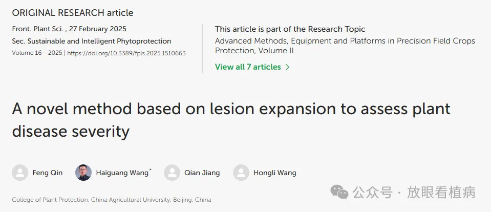 相关研究结果以论文“A novel method based on lesion expansion to assess plant disease severity”发表于“Frontiers in Plant Science”。研究得到了国家重点研发计划项目(2021YFD1401001)和国家自然科学基金项目(32072357)的资助。