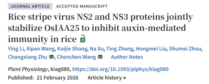 “Rice stripe virus NS2 and NS3 proteins jointly stabilize OsIAA25 to inhibit auxin-mediated immunity in rice”文章发表在《Plant Physiology》。水稻条纹病毒(RSV)编码的NS2和NS3蛋白可形成异二聚体,协同稳定水稻Aux/IAA家族的OsIAA25蛋白,通过干扰OsIAA25与生长素受体OsTIR1的互作,阻断其26S蛋白酶体介导的降解,进而抑制水稻生长素信号通路和生长素介导的免疫反应,最终促进RSV侵染;OsIAA25是RSV侵染的关键易感因子,为培育RSV抗性水稻提供了重要分子靶点。