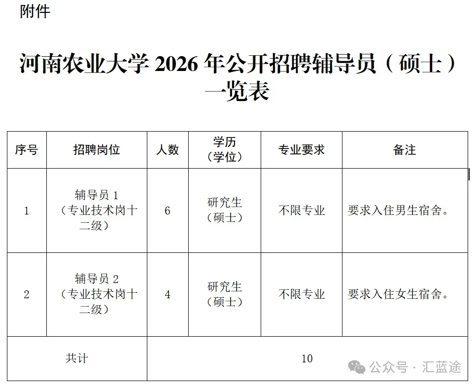 详见附件《河南农业大学2026年公开招聘辅导员(硕士)一览表》。