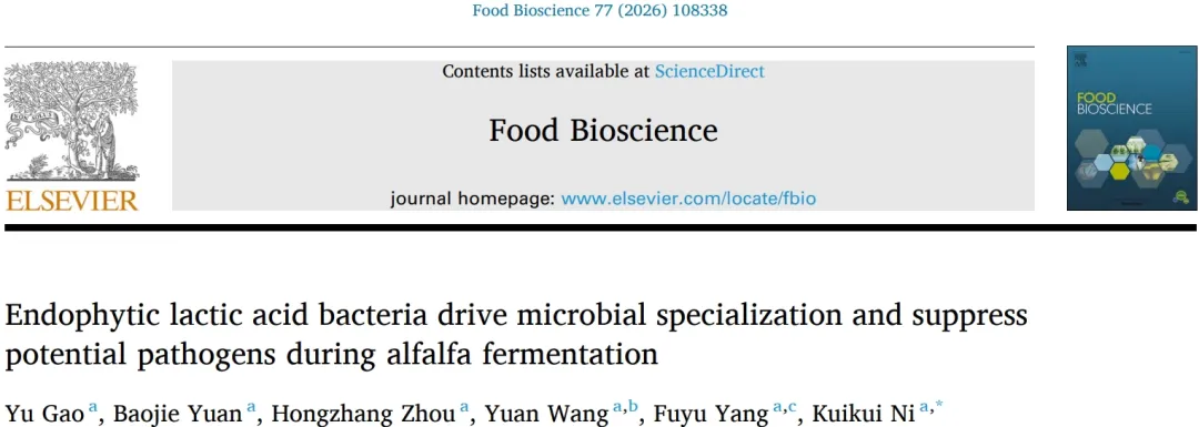 本研究全面评估了具抗菌活性的内生乳酸菌接种对苜蓿发酵的影响,重点分析了微生物群落代谢功能及潜在致病性风险。在自然发酵中会自然富集的植物乳杆菌,可推动发酵早期快速酸化,驱动群落功能特化,进而提升苜蓿发酵品质;戊糖片球菌则表现出独特的代谢特征,将其与植物乳杆菌联合接种时,发酵体系形成了更均衡的功能谱,简化了微生物网络复杂度,且使体系的潜在致病性和生物膜形成能力降至最低。上述研究结果证实,基于生态竞争力和代谢功能互补性筛选发酵剂菌株,是优化植物基底物发酵特性与生物安全性的有效策略。目前关于将具抗菌活性的内生乳酸菌用作发酵剂的研究较为有限,本研究为理解内生抗菌细菌的应用及其对植物发酵产品的后续影响提供了理论依据。未来研究应进一步探究该方法在不同植物底物中的普适性,并量化其在大规模发酵条件下对食源性致病菌的抑制效果。倪奎奎:中国农业大学草业科学与技术学院副教授,博士生导师。主要研究方向:饲草加工与利用,功能微生物资源挖掘。本研究由国家自然科学基金(项目编号:32471775) 资助。https://doi.org/10.1016/j.fbio.2026.108338标注 “原创” 仅表明为原创编译,本平台不主张对原文享有版权。