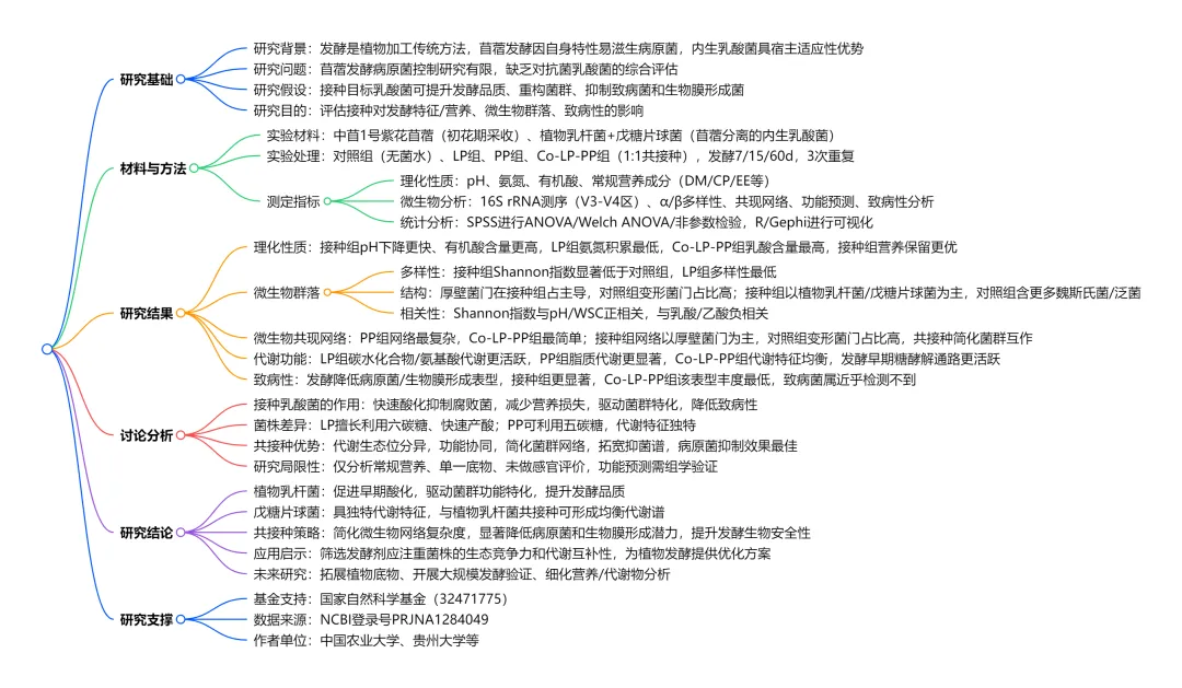 发酵是加工植物原料最古老且应用最广泛的方法之一,传统发酵主要依靠原料中的固有微生物完成,其中乳酸菌的快速定殖与代谢活动是发酵成功的关键,其通过营造酸性环境抑制有害微生物,进而改善发酵产品的风味、质地、安全性并延长货架期。现代发酵体系中,人工筛选的发酵剂已逐步替代自然发酵,以保障产品品质与安全的稳定性,而发酵底物本身作为塑造微生物群落结构的关键非生物因素,其与微生物的互作会显著影响发酵代谢特征与效果,因此,能适应植物原料固有特性并以内生形式定殖的乳酸菌,因具备更强的竞争优势,成为优良发酵剂筛选的重要考量标准,这一筛选策略也已在酸菜、果酒等植物基发酵中得到验证。苜蓿作为一种高蛋白豆科作物,素有 “牧草之王” 的美誉,但其水溶性碳水化合物含量低、缓冲能力强且固有乳酸菌数量少的特性,使其发酵过程中 pH 难以快速下降,为大肠杆菌 O157:H7、单核细胞增生李斯特菌、黄曲霉等食源性致病菌的存活创造了条件,带来严重的食品安全风险。目前,抗菌肽虽被尝试用于提升苜蓿芽苗的微生物安全性,但针对发酵苜蓿中食源性致病菌的防控研究仍较为匮乏;现有研究多仅评估抗菌乳酸菌对苜蓿发酵品质的提升作用,或利用常规乳酸菌抑制人工接种的致病菌,尚未在自然发酵条件下,全面探究抗菌乳酸菌对苜蓿发酵性能、营养组成、微生物群落动态、共现网络、代谢功能及致病菌表型的综合影响。基于此,本研究选取苜蓿源且对多种致病菌具有拮抗活性的两种内生乳酸菌开展相关研究,以期为优化苜蓿发酵工艺、提升发酵苜蓿生物安全性提供理论依据与技术支撑。