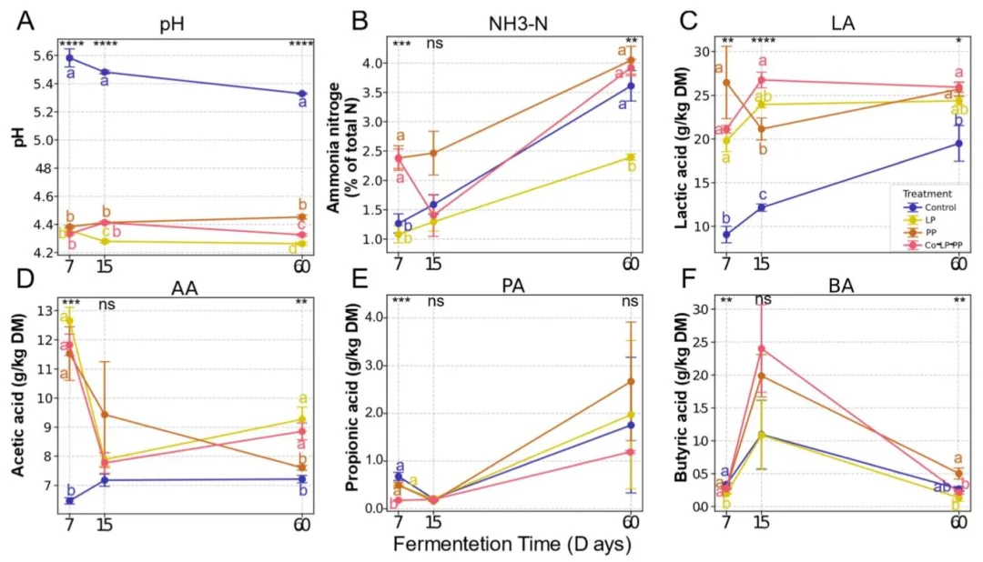 (A)pH 值,(B)氨氮(占总氮的百分比),(C)乳酸(克 / 千克干物质),(D)乙酸(克 / 千克干物质),(E)丙酸(克 / 千克干物质),(F)丁酸(克 / 千克干物质)含量。处理组:对照组(无菌水)、LP 组(植物乳杆菌)、PP 组(戊糖片球菌)、Co-LP-PP 组(植物乳杆菌与戊糖片球菌 1:1 混合)。