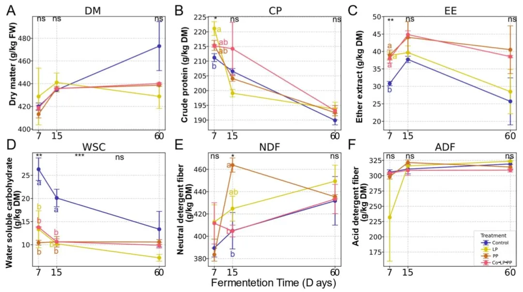 (A)干物质,(B)粗蛋白,(C)乙醚提取物(粗脂肪),(D)水溶性碳水化合物,(E)中性洗涤纤维,(F)酸性洗涤纤维。处理组:对照组(无菌水)、LP 组(植物乳杆菌)、PP 组(戊糖片球菌)、Co-LP-PP 组(植物乳杆菌与戊糖片球菌 1:1 混合)。