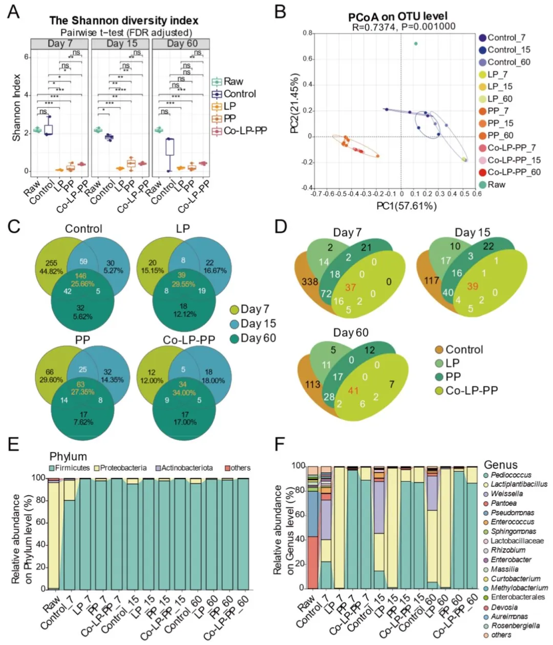 (A)新鲜苜蓿及不同处理厌氧发酵苜蓿的香农多样性指数(对照组:无菌水;LP 组:植物乳杆菌;PP 组:戊糖片球菌;Co-LP-PP 组:植物乳杆菌与戊糖片球菌 1:1 混合);(B)基于操作分类单元水平布雷 - 柯蒂斯相异系数的主坐标分析;(C)各时间点不同处理组间独有和共有操作分类单元的维恩图;(D)各处理组不同时间点独有和共有操作分类单元的维恩图;(E)优势菌门相对丰度堆叠柱状图;(F)优势菌属相对丰度堆叠柱状图(低丰度类群归为 “其他”)。