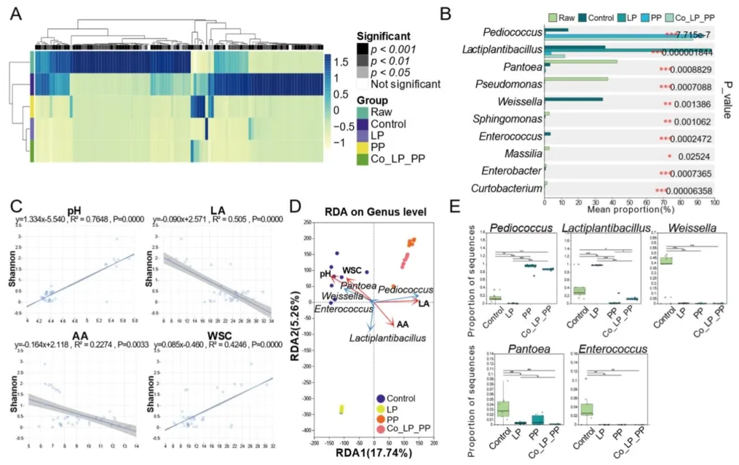(A)新鲜和厌氧发酵苜蓿中前 100 个操作分类单元平均相对丰度的热图;(B)新鲜和发酵苜蓿中存在显著差异的前 10 个菌属平均相对丰度柱状图;(C)香农多样性指数与关键发酵参数(乳酸、乙酸、水溶性碳水化合物)的线性回归分析;(D)微生物菌属与关键发酵 / 营养参数的冗余分析;(E)冗余分析中筛选出的五大核心菌属(戊糖片球菌、植物乳杆菌、魏斯氏菌、泛菌、肠球菌)相对丰度的箱线图。