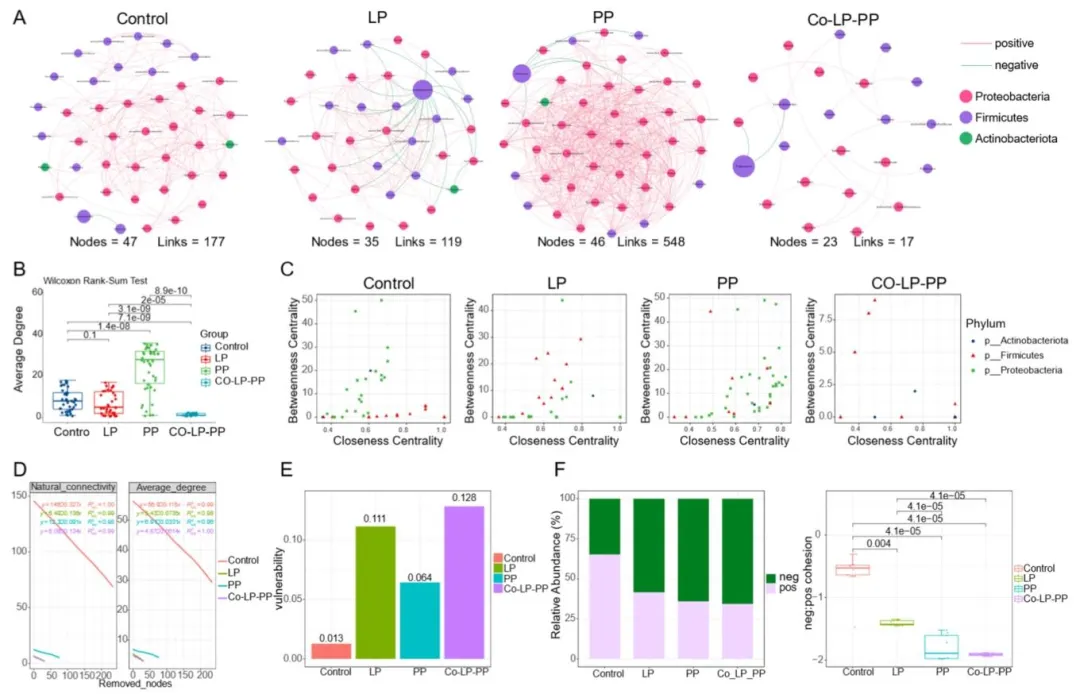 (A)四组处理的微生物共现网络(对照组:无菌水;LP 组:植物乳杆菌;PP 组:戊糖片球菌;Co-LP-PP 组:植物乳杆菌与戊糖片球菌 1:1 混合);(B)不同处理组平均节点度的比较;(C)各处理组介数中心性与接近中心性的散点图;(D)节点移除过程中微生物群落的网络稳健性分析;(E)厌氧发酵过程中不同处理苜蓿微生物群落的网络脆弱性分析;(F)节点逐步移除下不同处理组的网络内聚性分析。