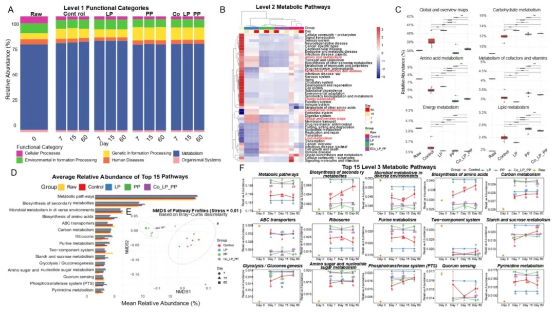 (A)新鲜苜蓿及不同乳酸菌处理厌氧发酵苜蓿的一级功能通路相对丰度(对照组:无菌水;LP 组:植物乳杆菌;PP 组:戊糖片球菌;Co-LP-PP 组:1:1 混合接种);(B)二级代谢通路的显著性热图;(C)关键二级代谢通路的相对丰度(含全局总览图、碳水化合物代谢、氨基酸代谢、辅因子和维生素代谢、能量代谢、脂质代谢);(D)平均相对丰度前 15 的三级通路;(E)基于布雷 - 柯蒂斯相异系数的功能谱非度量多维尺度分析;(F)新鲜苜蓿及不同处理不同发酵时间点平均相对丰度前 15 的三级代谢通路相对丰度。