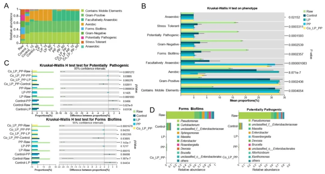 (A)新鲜苜蓿及不同乳酸菌处理厌氧发酵苜蓿微生物群落的预测表型特征相对丰度(对照组:无菌水;LP 组:植物乳杆菌;PP 组:戊糖片球菌;Co-LP-PP 组:1:1 混合接种);(B)微生物表型类群差异的克鲁斯卡尔 - 沃利斯检验;(C)潜在致病性和生物膜形成表型的克鲁斯卡尔 - 沃利斯检验;(D)与生物膜形成和潜在致病性相关的微生物菌属相对丰度。